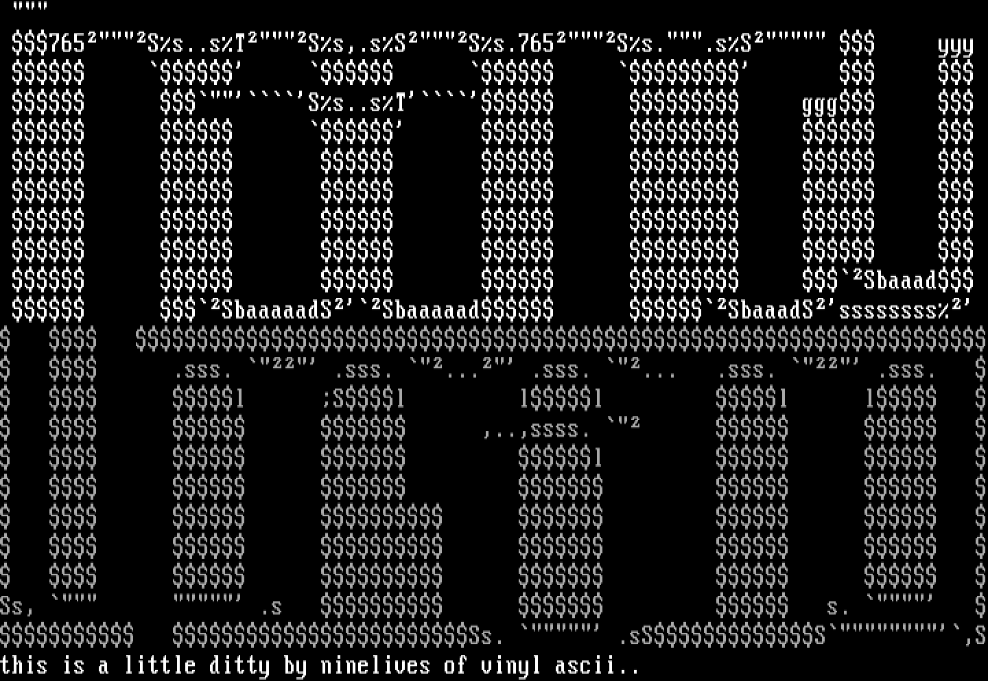 .sss. .sss. ... .sss. ... .sss. .sss. l Sl ll l l ,..,ssss. l Ss, .s s. Ss. .sSS,Sthis is a little ditty by ninelives of vinyl ascii..
