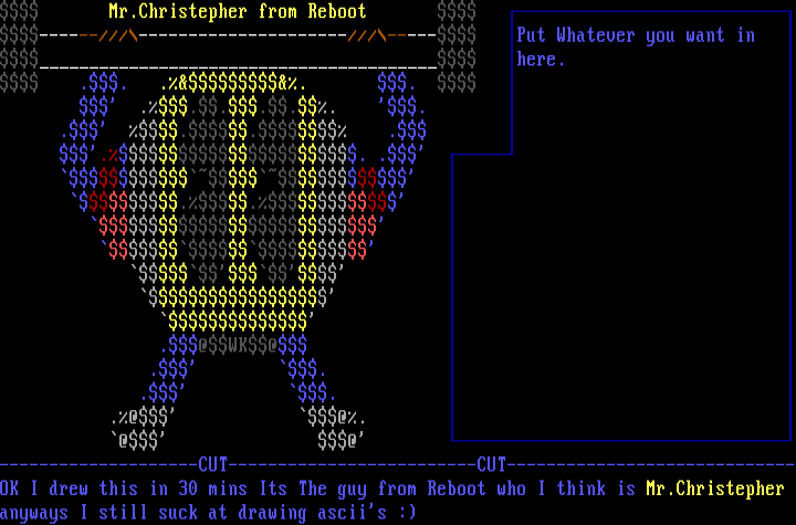 Mr.Christepher from Reboot ------ --------------------- ----- Put Whatever you want in here. .. .. . ...... . . .. . .. . .. .@WK@ . . . . .@ @. @ @ --------------------CUT-------------------------CUT-----------------------------OK I drew this in 30 mins Its The guy from Reboot who I think is Mr.Christepher