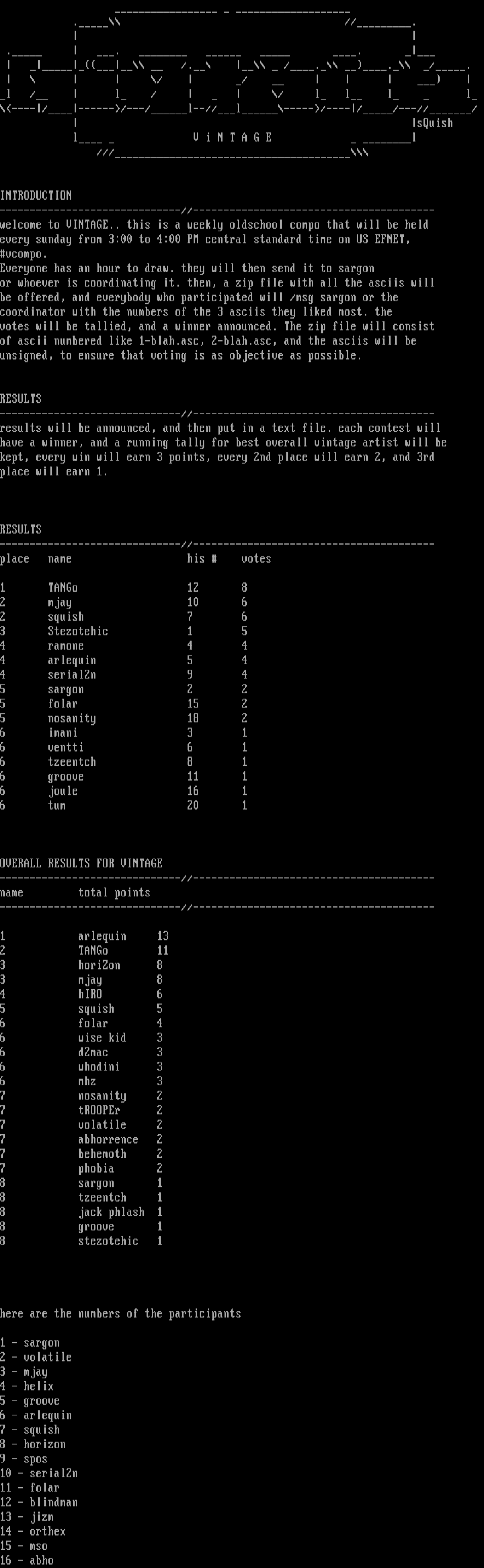 welcome to VINTAGE.. this is a weekly oldschool compo that will be held