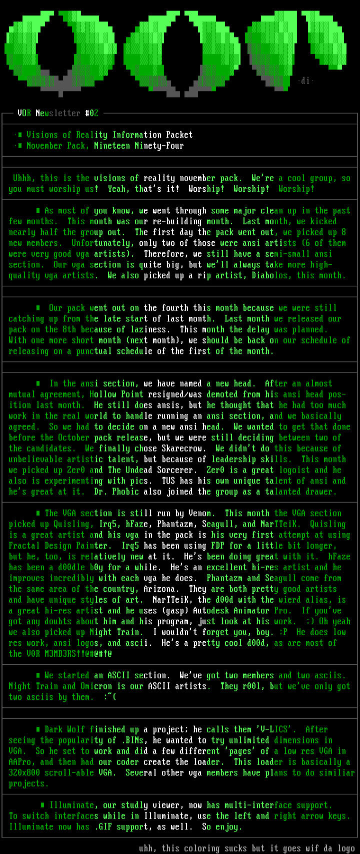 VOR Newsletter 02 Visions of Reality Information Packet November Pack, Nineteen Ninety-Four Uhhh, this is the visions of reality november pack. Were a cool group, so you must worship us! Yeah, thats it! Worship! Worship! Worship! As most of you know, we went through some major clean up in the past few months. This month was our re-building month. Last month, we kicked nearly half the group out. The first day the pack went out, we picked up 8 new members. Unfortunately, only two of those were ansi artists 6 of them were very good vga artists. Therefore, we still have a semi-small ansi section. Our vga section is quite big, but well always take more high- quality vga artists. We also picked up a rip artist, Diabolos, this month. Our pack went out on the fourth this month because we were still catching up from the late start of last month. Last month we released our pack on the 8th because of laziness. This month the delay was planned. With one more short month next month, we should be back on our schedule of releasing on a punctual schedule of the first of the month. In the ansi section, we have named a new head. After an almost mutual agreement, Hollow Point resigned/was demoted from his ansi head pos- ition last month. He still does ansis, but he thought that he had too much work in the real world to handle running an ansi section, and we basically agreed. So we had to decide on a new ansi head. We wanted to get that done before the October pack release, but we were still deciding between two of the candidates. We finally chose Skarecrow. We didnt do this because of unbelievable artistic talent, but because of leadership skills. This month we picked up Zer0 and The Undead Sorcerer. Zer0 is a great logoist and he also is experimenting with pics. TUS has his own unique talent of ansi and hes great at it. Dr. Phobic also joined the group as a talanted drawer. The VGA section is still run by Venom. This month the VGA section picked up Quisling, Irq5, hFaze, Phantazm, Seagull, and NarTTeiK. Quisling is a great artist and his vga in the pack is his very first attempt at using Fractal Design Painter. Irq5 has been using FDP for a little bit longer, but he, too, is relatively new at it. Hes been doing great with it. hFaze has been a d00dle b0y for a while. Hes an excellent hi-res artist and he improves incredibly with each vga he does. Phantazm and Seagull come from the same area of the country, Arizona. They are both pretty good artists and have unique styles of art. NarTTeiK, the d00d with the wierd alias, is a great hi-res artist and he uses gasp Autodesk Animator Pro. If youve got any doubts about him and his program, just look at his work. : Oh yeah we also picked up Night Train. I wouldnt forget you, boy. :P He does low res work, ansi logos, and ascii. Hes a pretty cool d00d, as are most of the V0R M3MB3RS!!@@!@ We started an ASCII section. Weve got two members and two asciis. Night Train and Omicron is our ASCII artists. They r00l, but weve only got two asciis by them. : Dark Wolf finished up a project he calls them V-LICS. After seeing the popularity of .BINs, he wanted to try unlimited dimensions in VGA. So he set to work and did a few different pages of a low res VGA in AAPro, and then had our coder create the loader. This loader is basically a 320x800 scroll-able VGA. Several other vga members have plans to do similiar projects. Illuminate, our studly viewer, now has multi-interface support. To switch interfaces while in Illuminate, use the left and right arrow keys. Illuminate now has .GIF support, as well. So enjoy. uhh, this coloring sucks but it goes wif da logo