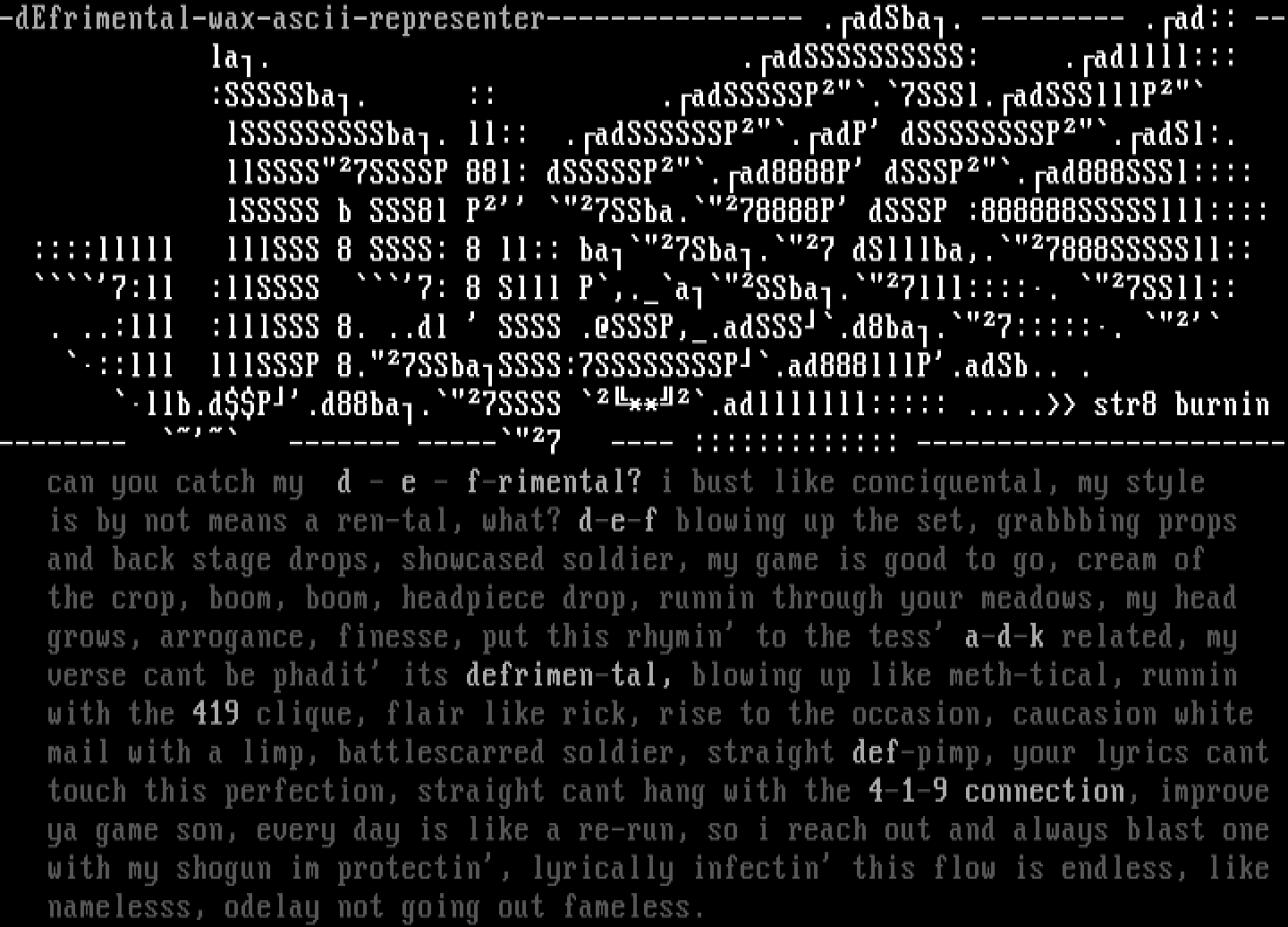 -dEfrimental-wax-ascii-representer---------------- .adSba. --------- .ad:: -- la. .adSSSSSSSSSS: .adllll:::