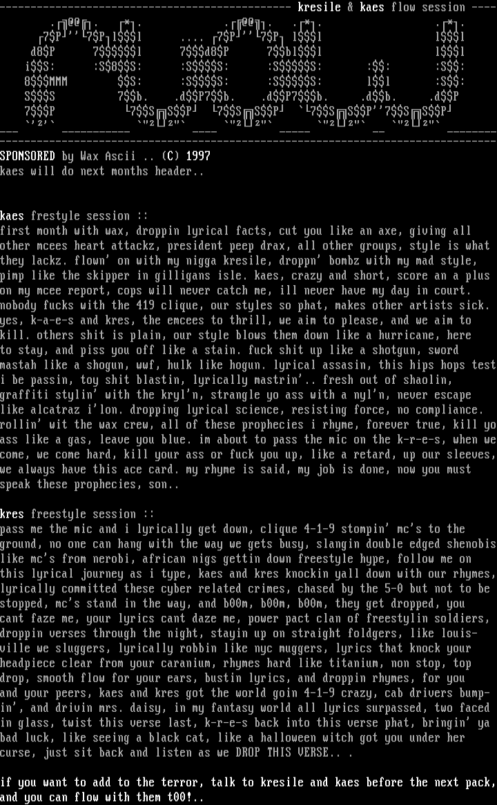 rollin wit the wax crew, all of these prophecies i rhyme, forever true, kill yoass like a gas, leave you blue. im about to pass the mic on the k-r-e-s, when wecome, we come hard, kill your ass or fuck you up, like a retard, up our sleeves,we always have this ace card. my rhyme is said, my job is done, now you must