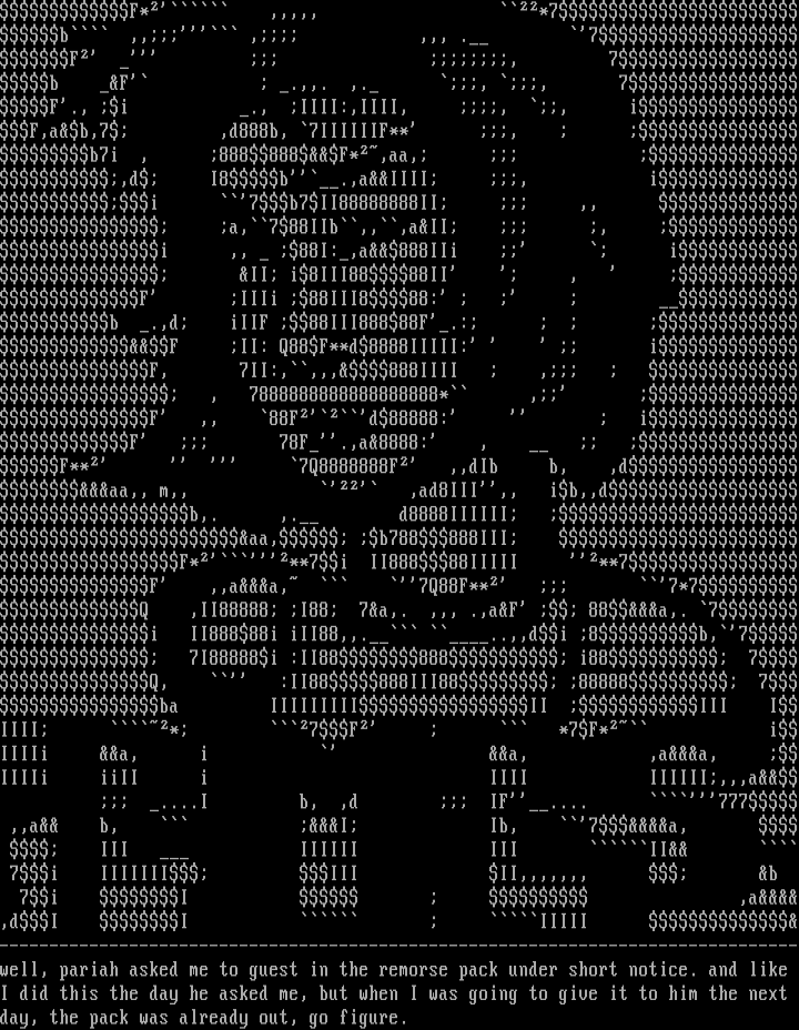 7i I ,a,dI I IIIII --------------------------------------------------------------------------------well, pariah asked me to guest in the remorse pack under short notice. and like