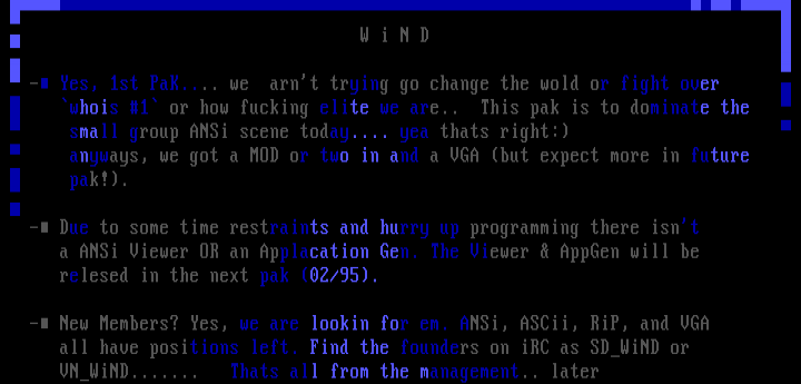 we are lookin for em. ANSi, ASCii, RiP, and VGA all have positions left. Find the founders on iRC as SDWiND or VNWiND....... Thats all from the m