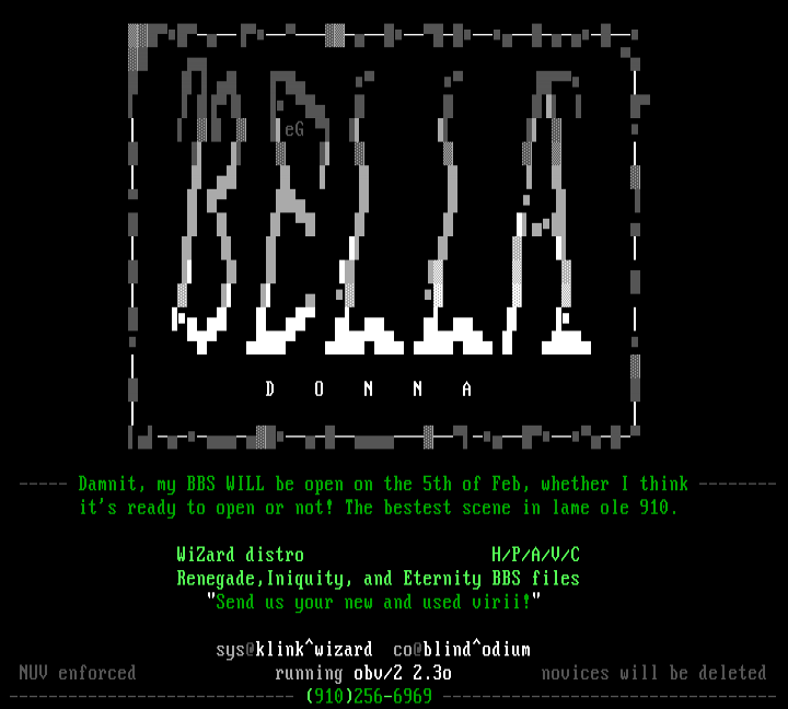 ----- Damnit, my BBS WILL be open on the 5th of Feb, whether I think -------- its ready to open or not! The bestest scene in lame ole 910.