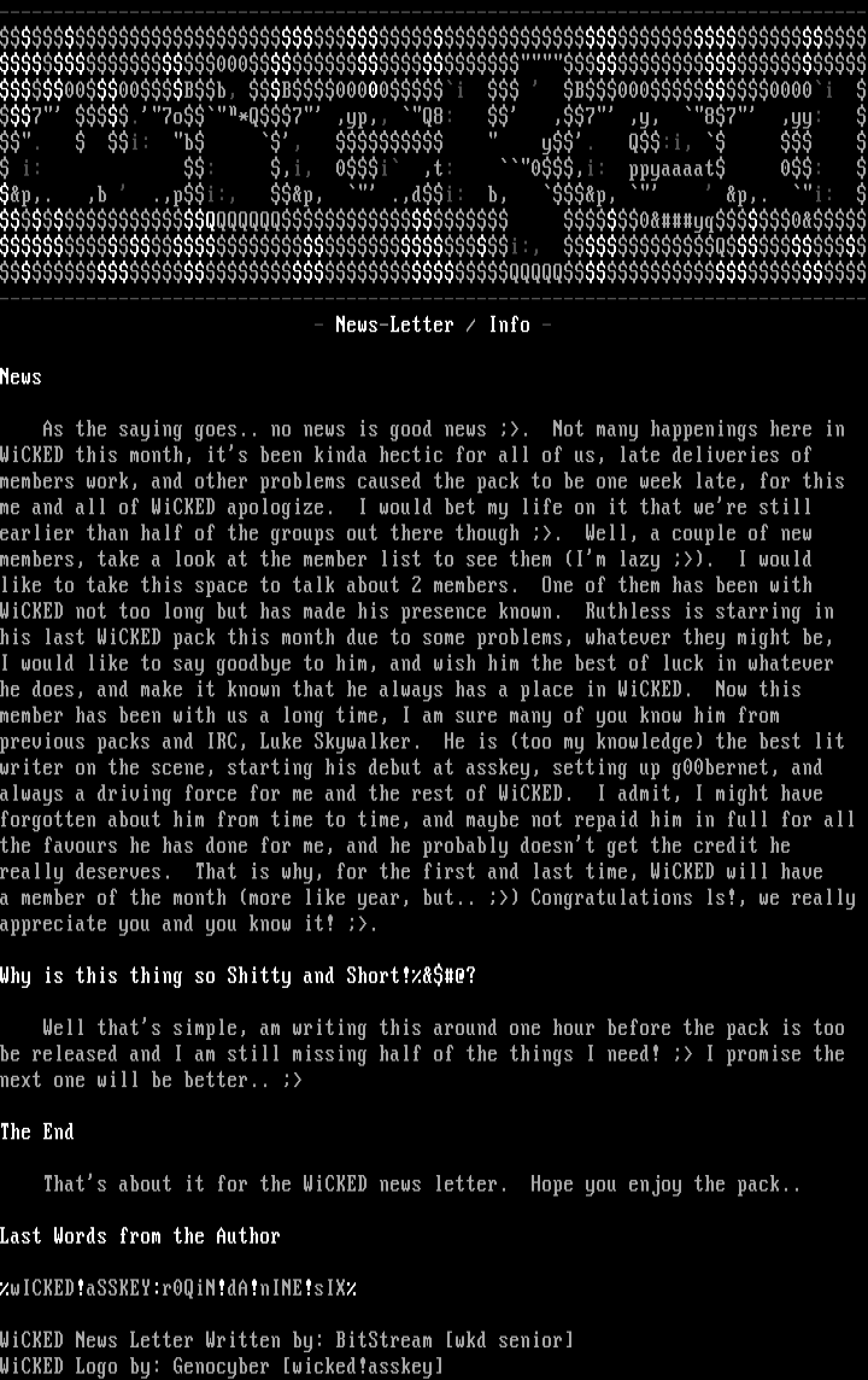 ood news . Not many happenings here inWiCKED this month, its been kinda hectic for all of us, late deliveries ofmembers work, and other problems caused the pack to be one week late, for thisme and all of WiCKED apologize. I