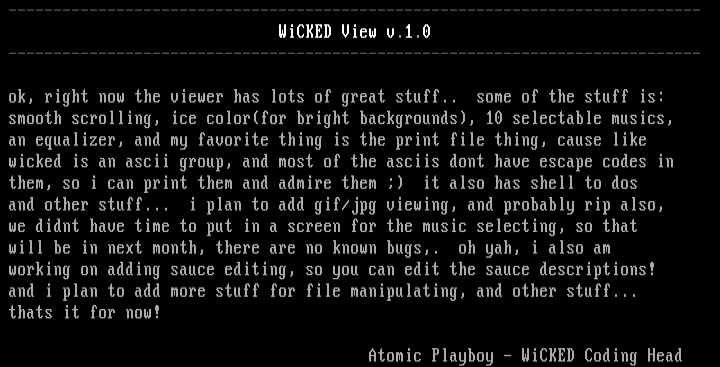 cked is an ascii group, and most of the asciis dont have escape codes in them, so i can print them and admire them it also has shell to dos and other stuff... i plan to add gif/jpg viewing, and probably rip also, we didnt ha