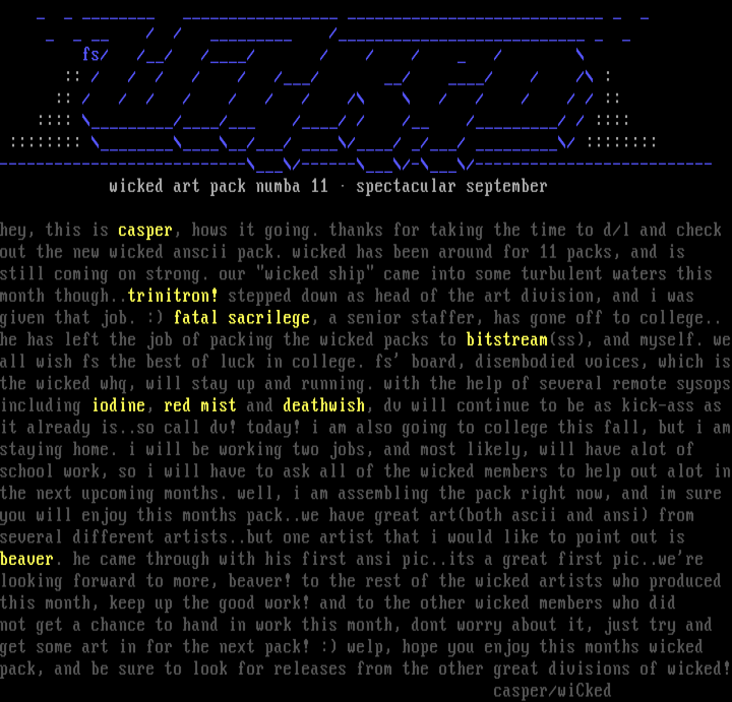 hey, this is casper, hows it going. thanks for taking the time to d/l and check out the new wicked anscii pack. wicked has been around for 11 packs, and is