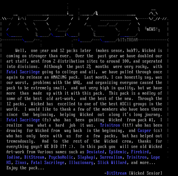 Wicked has excelled to one of the best ASCii groups in the world. I would like to thank a few of the members who have been there since the beginning, helping Wicked out