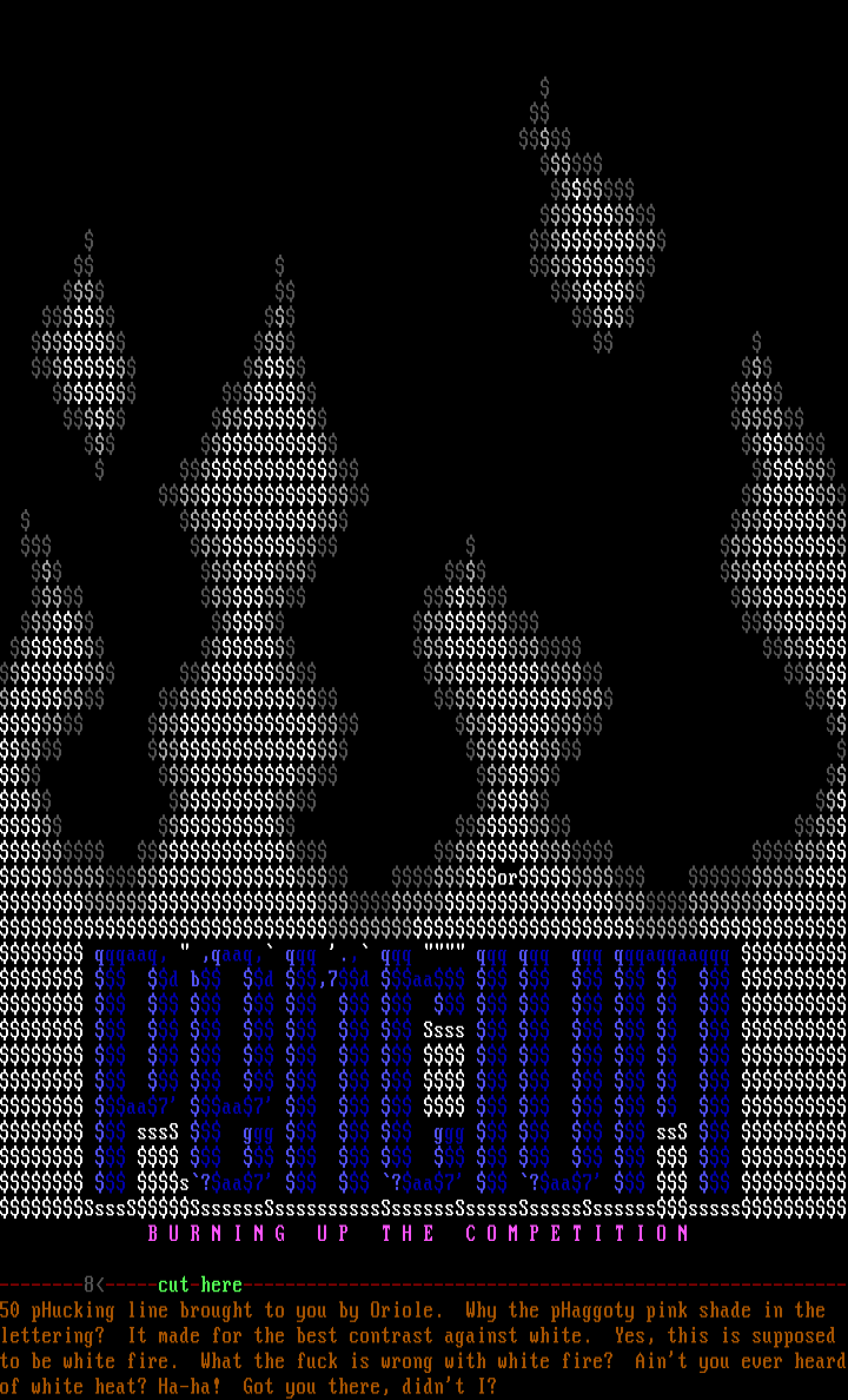 --------8-----cut-here---------------------------------------------------------50 pHucking line brought to you by Oriole. Why the pHaggoty pink shade in the