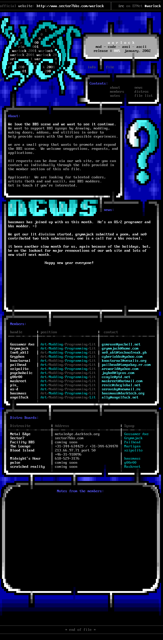 official website: http://www.sector7bbs.com/warlock irc on EFNet warlock