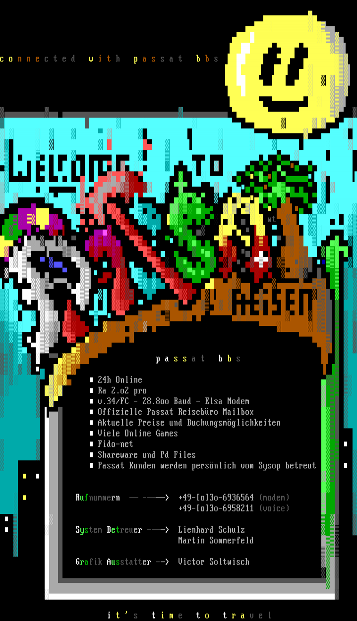 p a s s a t b b s 24h Online Ra 2.o2 pro v.34/FC - 28.8oo Baud - Elsa Modem Offizielle Passat Reisebro Mailbox Aktuelle Preise und Buchungsmglichkeiten Viele Online Games Fido-net Shareware und Pd Files