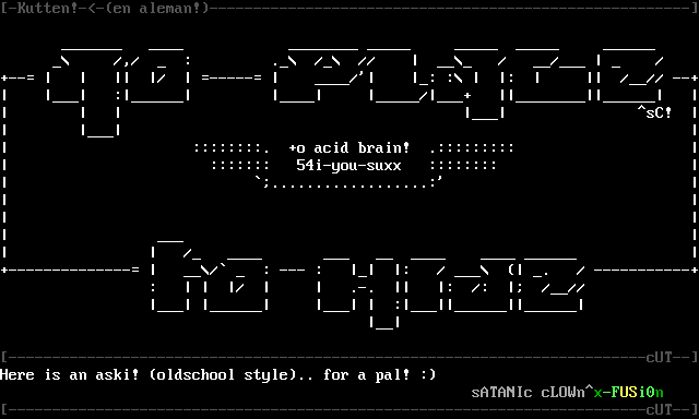 +-- / ----- / : : : --+ : /+ sC! ::::::::. +o acid brain! .::::::::: ::::::: 54i-you-suxx :::::::: ..................: / +-------------- / : --- : : / . / -----------+ : / .-. : /: