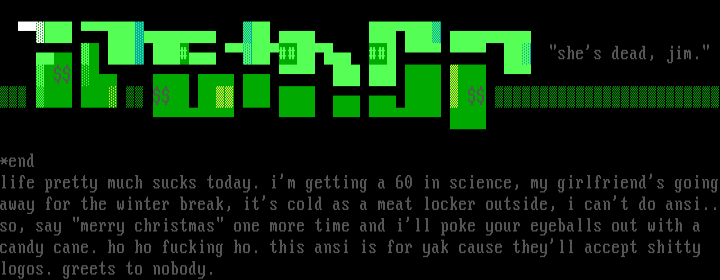 life pretty much sucks today. im getting a 60 in science, my girlfriends goingaway for the winter break, its cold as a meat locker outside, i cant do ansi..so, say merry christmas one more time and ill poke your eyeballs out with a candy cane. ho ho fucking ho. this ansi is for yak cause theyll accept shitty