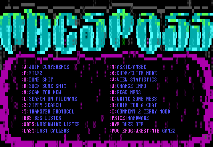 :J:JOIN CONFERENCE :M:ASKIE/ANSEE :F:FILEZ :X:DUDE/ELITE MODE :U:DUMP SHIT :V:VIEW STATISTICS :D:SUCK SOME SHIT :W:CHANGE INFO :N:SCAN FOR NEW :R:READ MESS :L:SEARCH ON FILENAME :E:WRITE SOME MESS :Z:ZIPPY SEARCH :O:CRIE FOR A CHAT :T:TRANSFER PROTOCOL :C:COMMENT 2 TERRY MOOD :BBS:BBS LISTER :PRICE:HARDWARE :WBBS:WORLDWIDE LISTER :BYE:BUZZ OFF :LAST:LAST CALLERS :POG:EPOG:WREST:NIB:GAMEZ jB