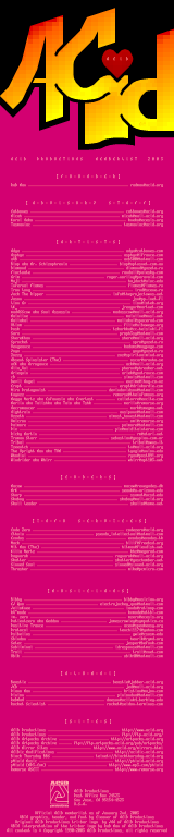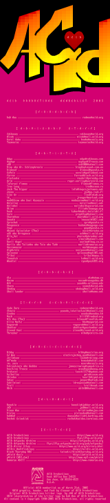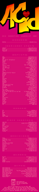 acid (63) amish (2) anal (2) apathy (10) arc (2) bamboo (1) blocktronics (106) break (6) cia (13) deranged (2) dezign (55) duo daughters (3) echo (2) eclipse (1) force (2) fuel (3) gas (1) ice (2) impure (9) lure (1) mistigris (7) new school (77) polyester (2) prelude (2) remorse (6) sargahd (1) secular (3) sense imagery (2) shade (5) smr (1) teklordz (1) titan (6)